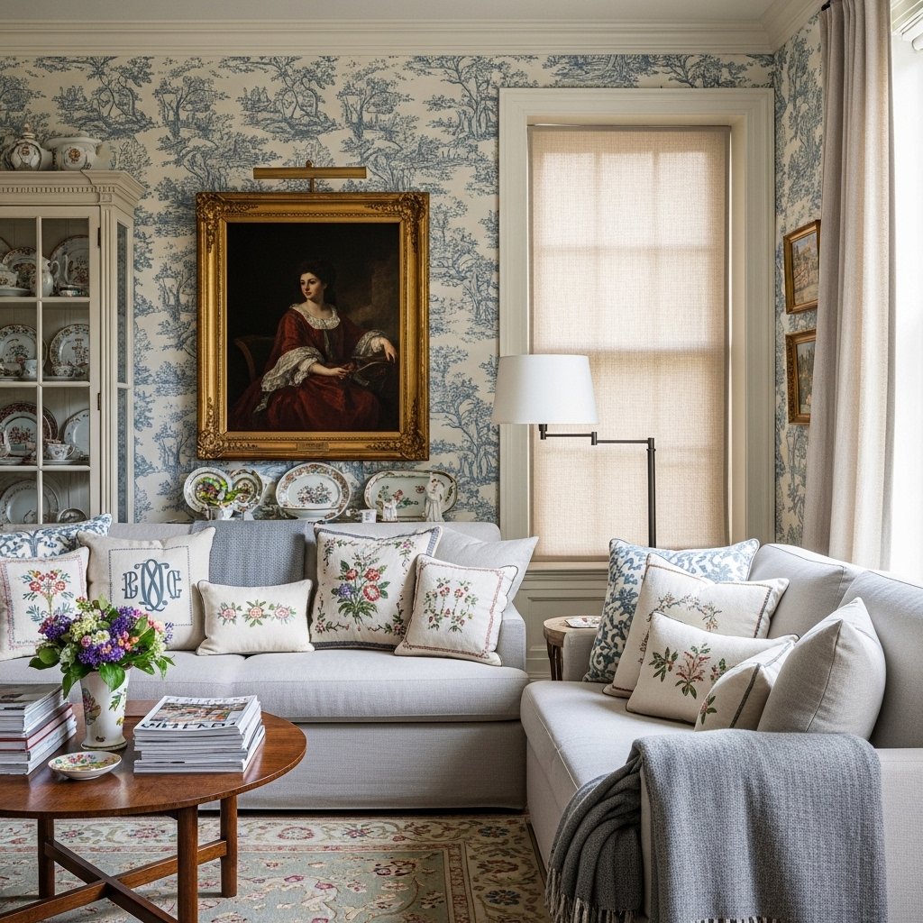Grandmillennial — that wonderfully irreverent blending of traditional, grandma-approved aesthetics with modern sensibility — has evolved beautifully in 2026. It’s no longer just about chintz and china cabinets; it’s become a broader celebration of the decorative, the ornate, and the unabashedly pretty. Think embroidered pillows on a contemporary sofa, wallpaper with classic toile prints in unexpected colorways, vintage silver on open shelving, and oil paintings in gilded frames hung gallery-style on a modern wall. Grandmillennial says that maximalism can be refined, that traditional elements are always relevant when used with intention, and that the things your grandmother loved were actually absolutely beautiful all along.